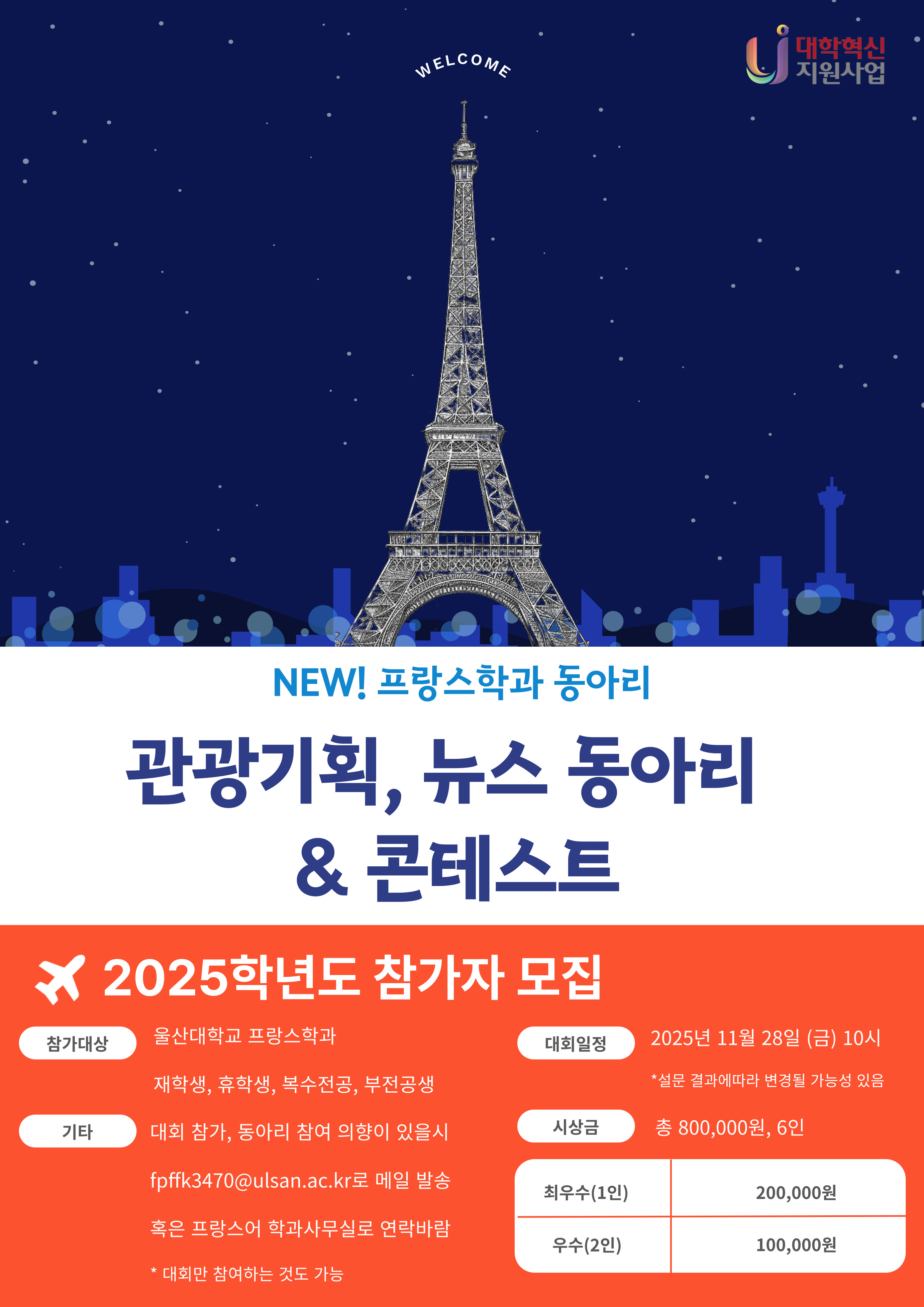 2025년부터 신설된 프랑스 뉴스 동아리, 프랑스 관광기획 동아리를 홍보합니다. 해당 동아리는 선후배와 담소를 나눌 수 있는 좋은 학과 교류의 장이 될 것 같습니다. 또, 각 동아리마다 대회도 개최될 예정입니다. 각각 40만원씩, 총 80만원의 시상금도 준비되어 있으며, 동아리 활동 없이 대회만 참여하셔도 됩니다. 학과학생들 대상의 대회이기 때문에 대회 규모가 크지 않습니다! 간단하게 수상경험과 시상금과 타갈 수 있는 좋은 기회이기 때문에 많은 참여 부탁드립니다. :D <프랑스 관광 기획 전략 대회> 일시 : 11월 28일 (금) 10시 *학생 선호 설문조사 결과에 따라 일정이 바뀔 수도 있습니다. 내용 : 프랑스 국내, 프랑스 해외영토의 관광지를 지정하여 관광 계획을 짜고, 관광 전략 상품으로 어떻게 개발할 것인가에 조사함. 발표함. 그리고 ppt자료 등의 매체와 함께 5~10분 발표함. (심사기준은 첨부파일 참고) <프랑스 뉴스 대회> 일시 : 11월 28일 (금) 11시 *학생 선호 설문조사 결과에 따라 일정이 바뀔 수도 있습니다. 내용 : 프랑스의 이슈 혹은 프랑스와 관련된 이슈를 조사하여 기사를 작성한다. 그리고 ppt자료 등의 매체와 함께 5~10분 발표함. (심사기준은 첨부파일 참고) <상금> 최우수 - 20만원 (각 대회별 1인) / 우수 - 10만원 (각 대회별 2인) 총 80만원 (40만원x2) + 참가시 식사 및 다과가 제공될 예정임. <신청 양식> 대회 참가를 원하는 학생분들은 아래양식을 조교 메일 fpffk3470@ulsan.ac.kr 로 제출바랍니다. [ 이름 / 학번 / 참여 종목 (둘 다, 뉴스만, 관광 기획만) / 동아리 활동 참여 의사 (o,x) ] <첨부 파일> 1. 대학혁신지원사업_프랑스어프랑스학과 심사기준 2. 프랑스학과동아리 및 대회 포스터 2 ![]() |