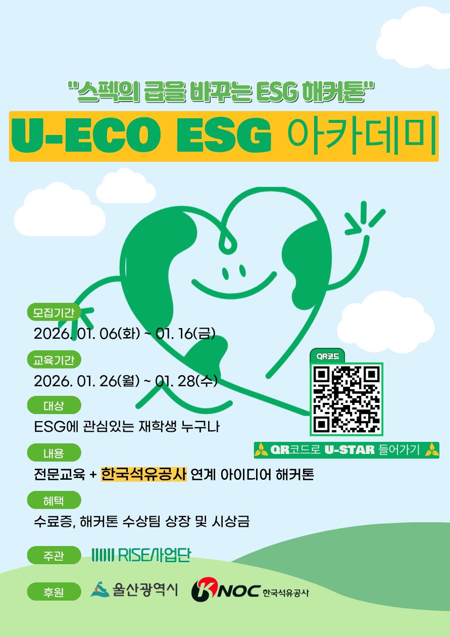 본 RISE사업단 기업지원R&D센터에서는 지역 맞춤형 문제 해결 중심의 교육을 통한, 탄소중립형 실무인재 양성을 위하여 다음과 같이 '2025학년도 U-ECO ESG 아카데미'를 운영하고자 합니다. 이와 관련하여 많은 학생들이 참여할 수 있도록 홍보에 협조하여 주시기 바랍니다.